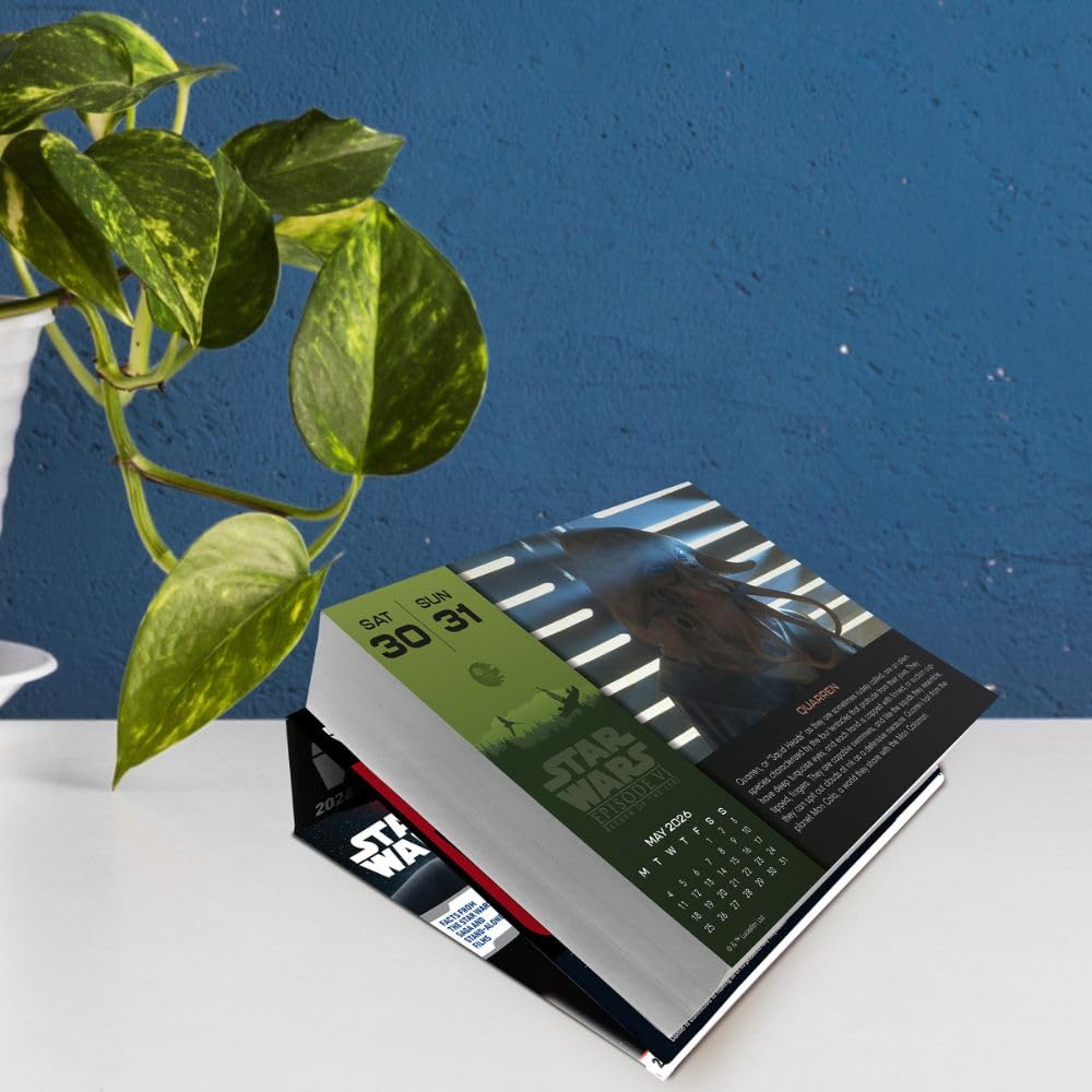 Experience the galaxy far, far away every day with this official Star Wars Classic 2026 desk block calendar! This official desk block has been designed to either be laid flat or the cover doubles over as its own stand for an upright angle on your desk. Featuring daily facts and images from the legendary franchise, this is a must-have for any Star Wars fan. This calendar is plastic-free. .