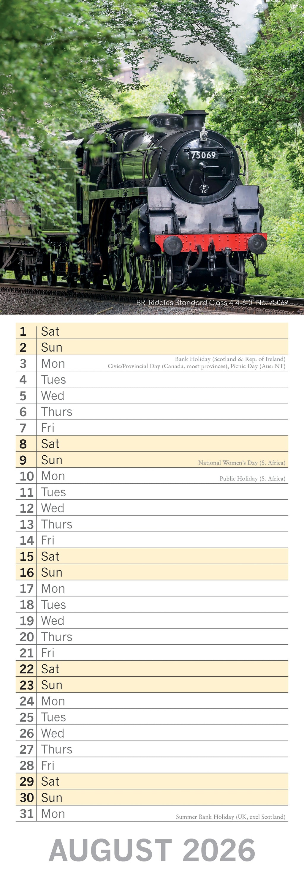 Stay organized in style with the beautifully crafted 2026 Steam Trains Slim Wall Calendar from The Gifted Stationery Co. Perfect for kitchens, offices, or narrow spaces at home, this calendar also makes a charming holiday gift for friends and family. It showcases 12 captivating images of Steam Trains—one for each month—displayed above a practical date layout.