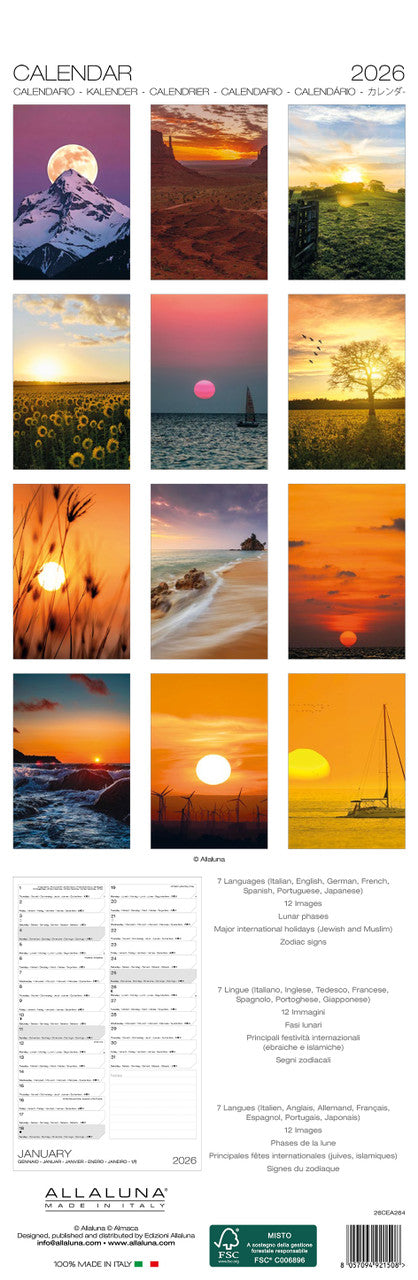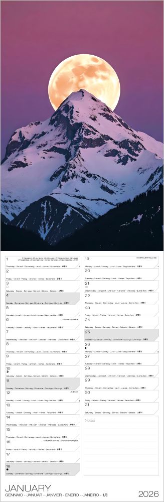 - Large grid with lunar phases, international holidays including Jewish and Muslim, zodiac signs