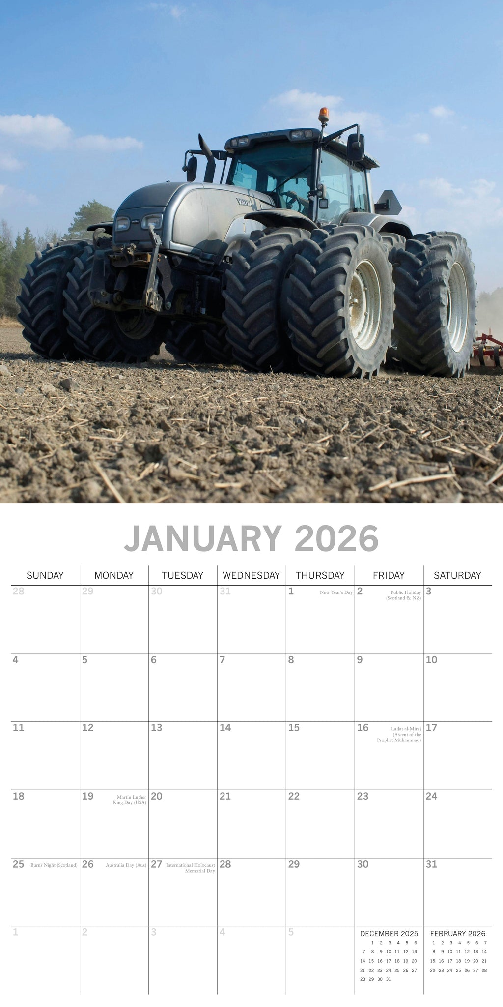 The 2026 Tractors Square Wall Calendar spans 16 months—from September 2025 through December 2026—with the final four months of 2025 presented in a compact, mini-grid format. Each monthly spread begins on Sunday, with the top half showcasing a beautiful image and the bottom half featuring an easy-to-read monthly layout. The calendar comes shrink-wrapped for protection. .