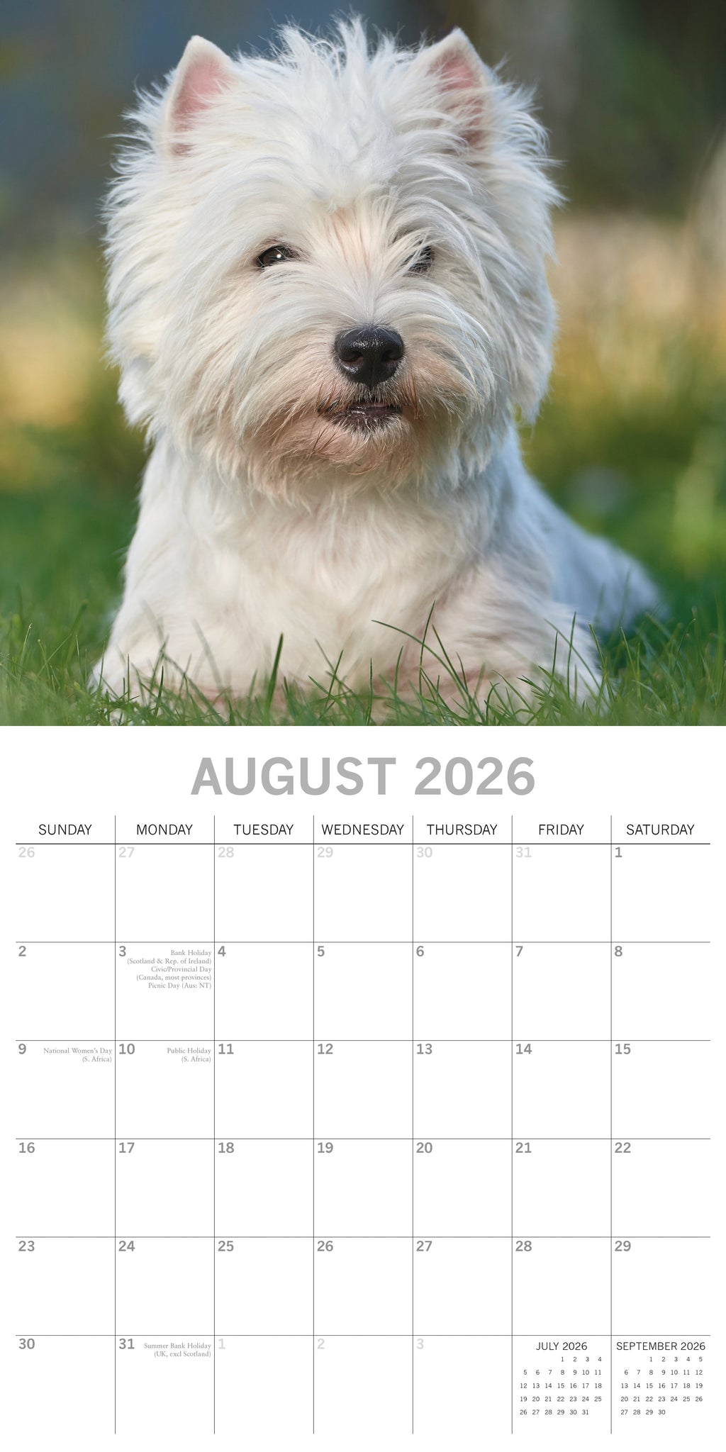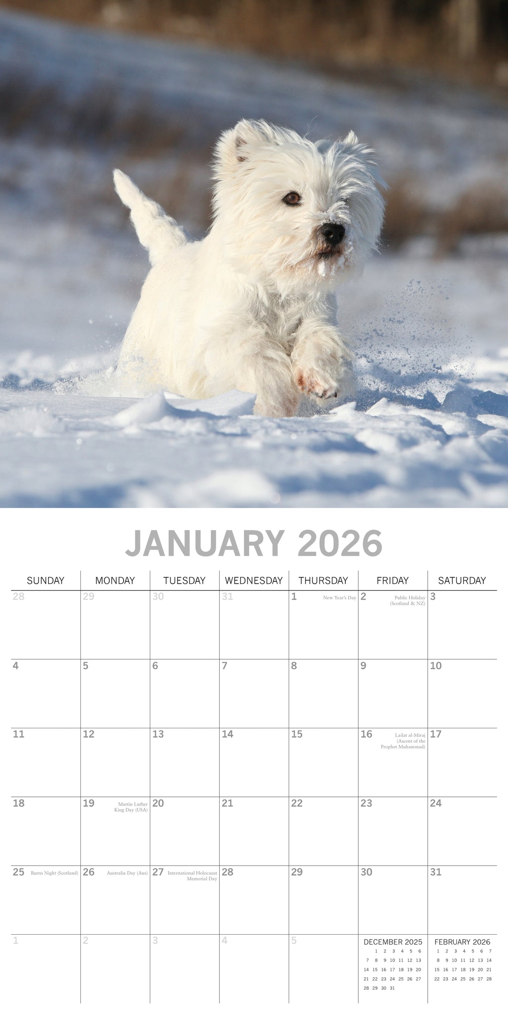 The 2026 West Highland White Terriers Square Wall Calendar spans 16 months—from September 2025 through December 2026—with the final four months of 2025 presented in a compact, mini-grid format. Each monthly spread begins on Sunday, with the top half showcasing a beautiful image and the bottom half featuring an easy-to-read monthly layout. The calendar comes shrink-wrapped for protection. .