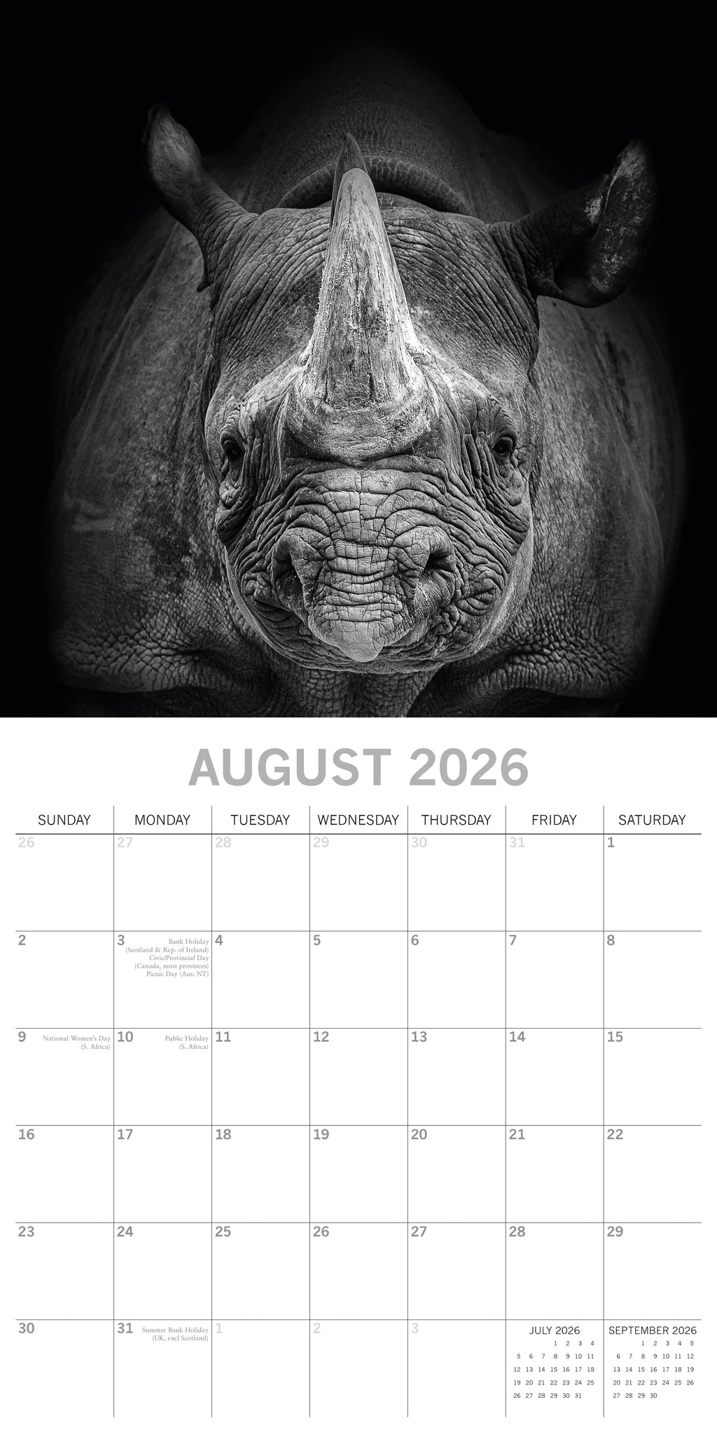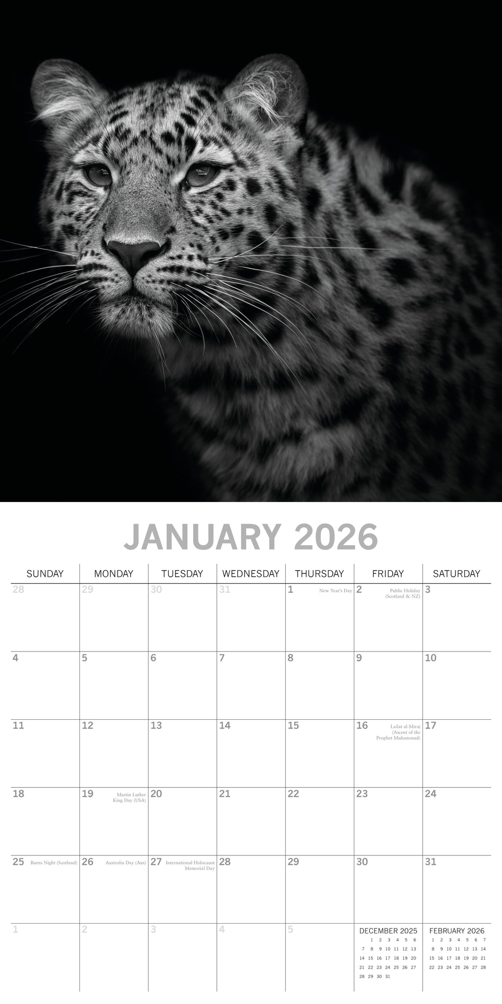 The 2026 Wild Portraits Square Wall Calendar spans 16 months—from September 2025 through December 2026—with the final four months of 2025 presented in a compact, mini-grid format. Each monthly spread begins on Sunday, with the top half showcasing a beautiful image and the bottom half featuring an easy-to-read monthly layout. The calendar comes shrink-wrapped for protection. .