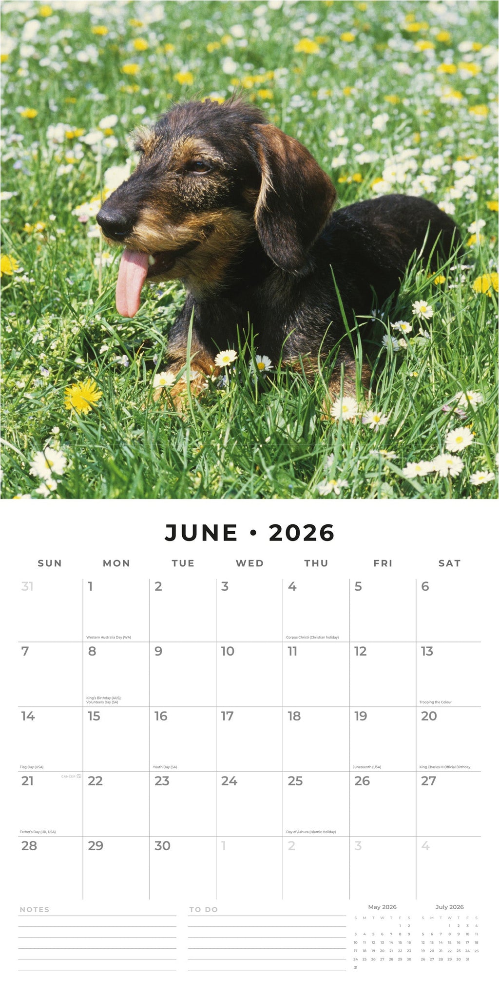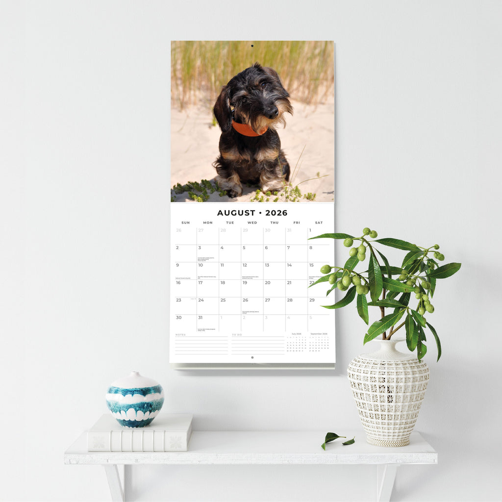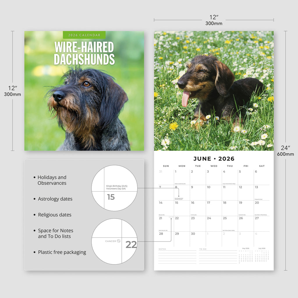 Packaged in a 100% plastic-free, sustainable, FSC-certified envelope, this 2026 Wire-haired Dachshunds Square Wall Calendar from Red Robin Publishing Ltd includes 12 months plus 4 bonus months, providing extended planning and a full year of enjoyment. .