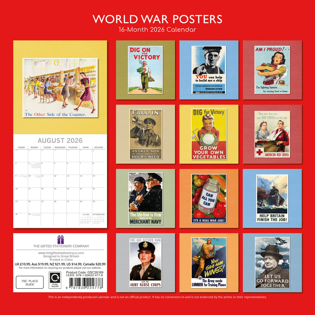 This exquisitely designed 2026 World War Posters Square Wall Calendar from The Gifted Stationery Co. is ideal for your home or office and makes a thoughtful holiday gift for your loved ones. It features 13 stunning images of World War Posters and includes large date grids for jotting down appointments, birthdays, and other important events. When opened, it measures 30 x 60 cm.