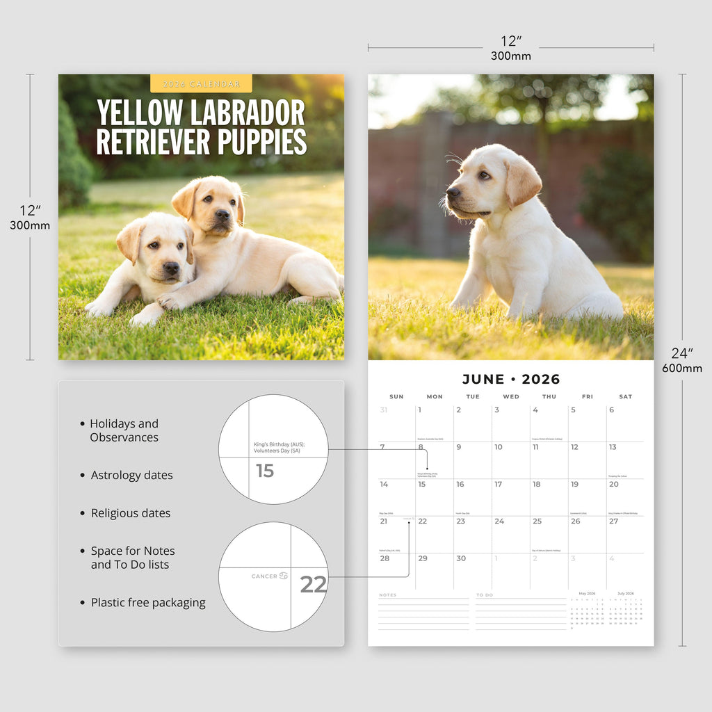 Packaged in a 100% plastic-free, sustainable, FSC-certified envelope, this 2026 Yellow Labrador Retriever Puppies Square Wall Calendar from Red Robin Publishing Ltd includes 12 months plus 4 bonus months, providing extended planning and a full year of enjoyment. .