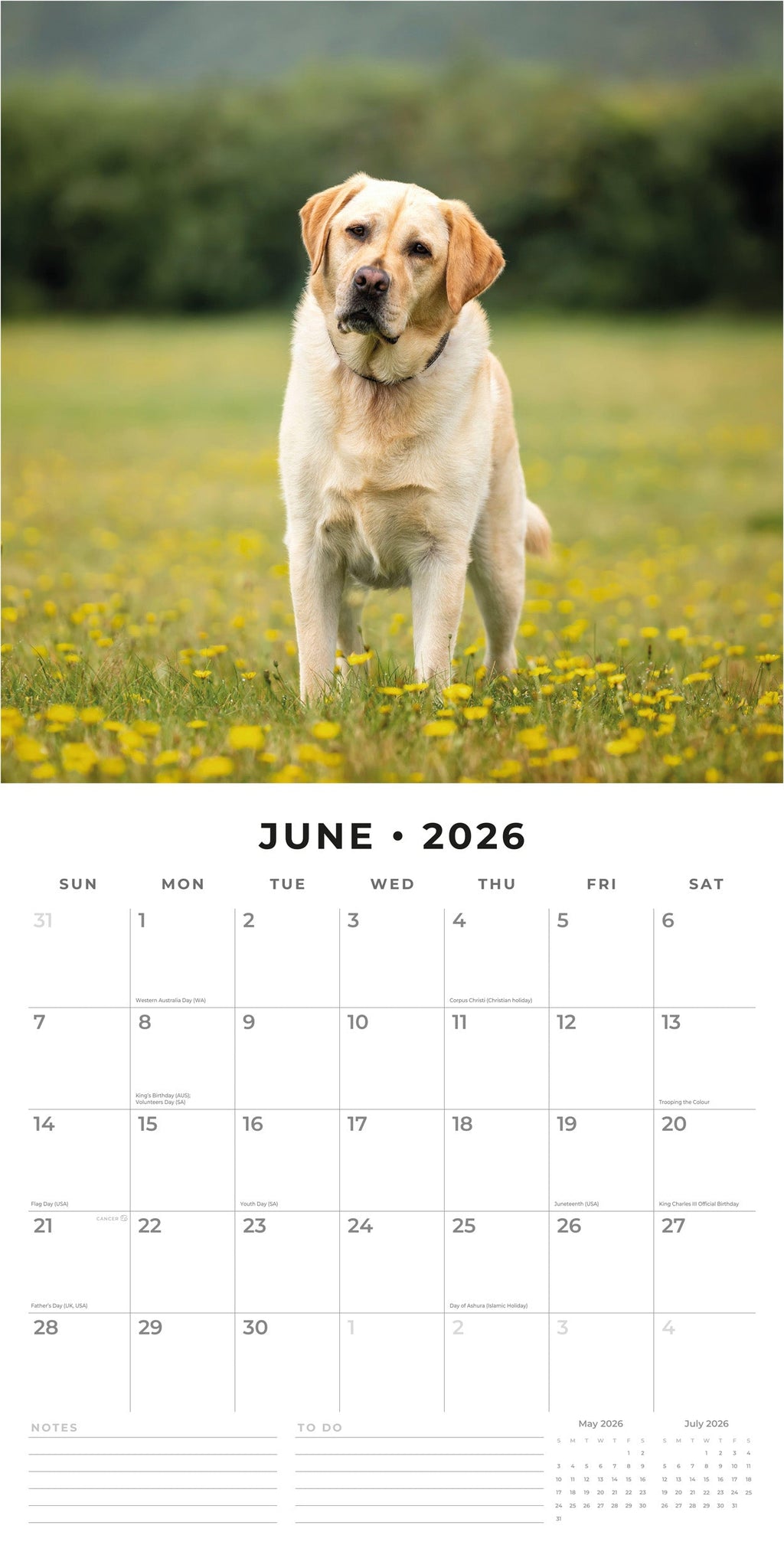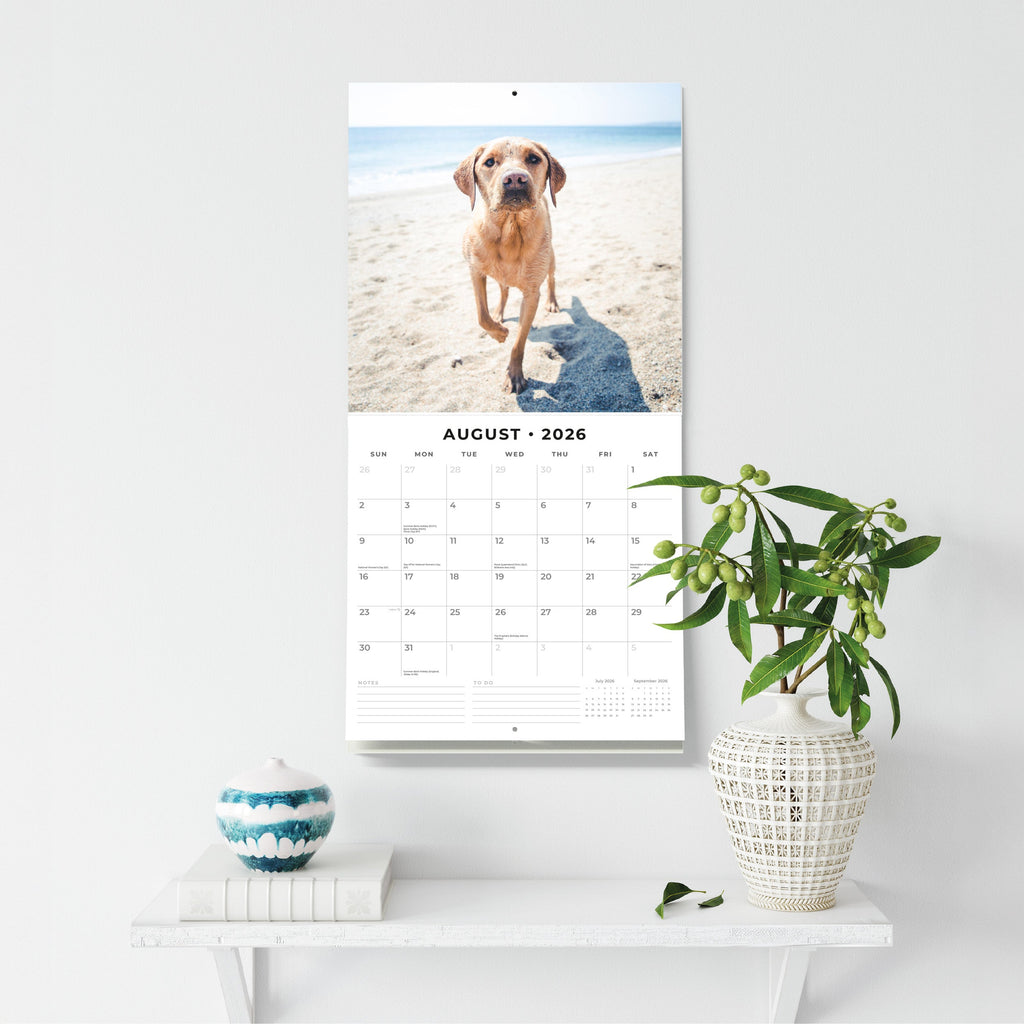 Packaged in a 100% plastic-free, sustainable, FSC-certified envelope, this 2026 Yellow Labrador Square Wall Calendar from Red Robin Publishing Ltd includes 12 months plus 4 bonus months, providing extended planning and a full year of enjoyment. .