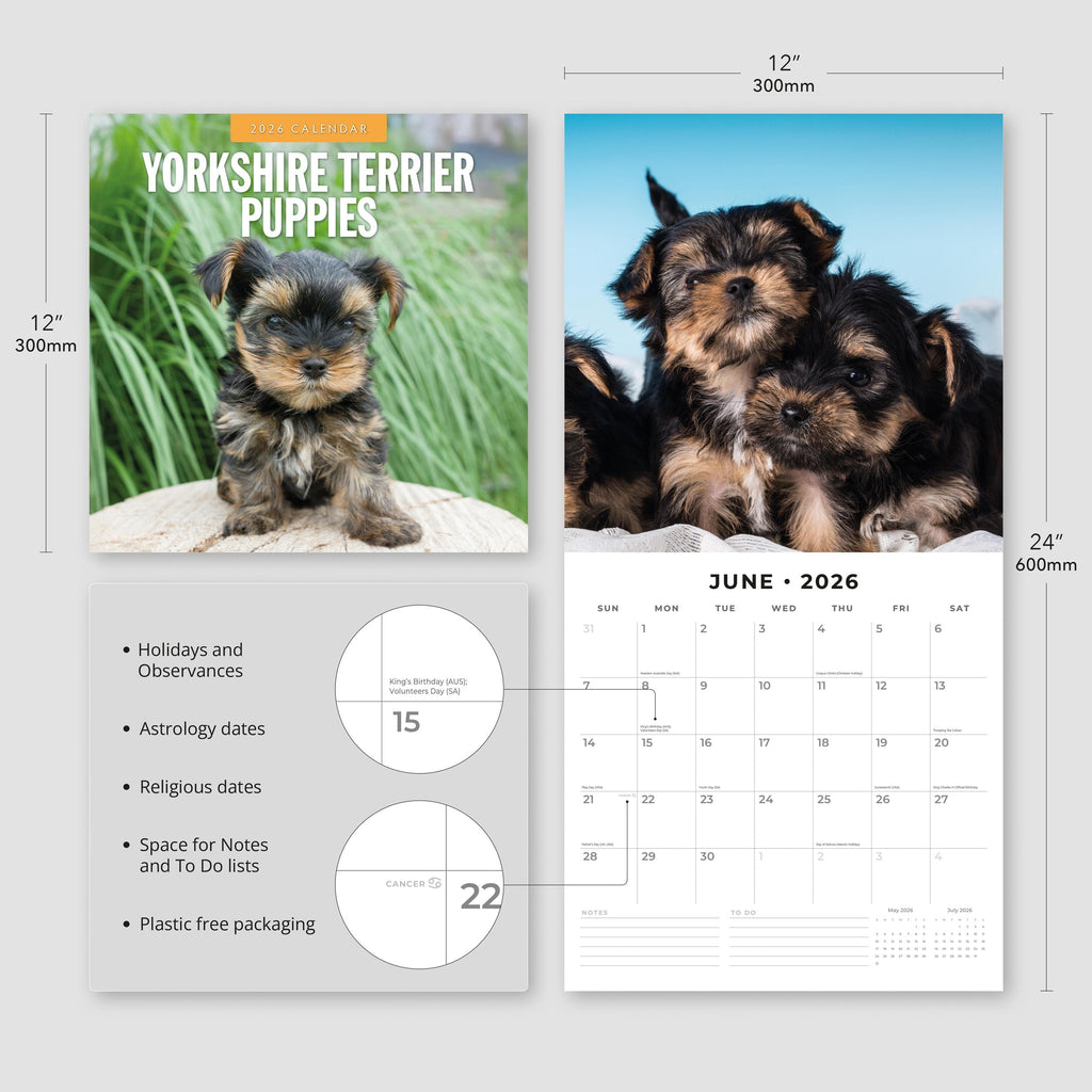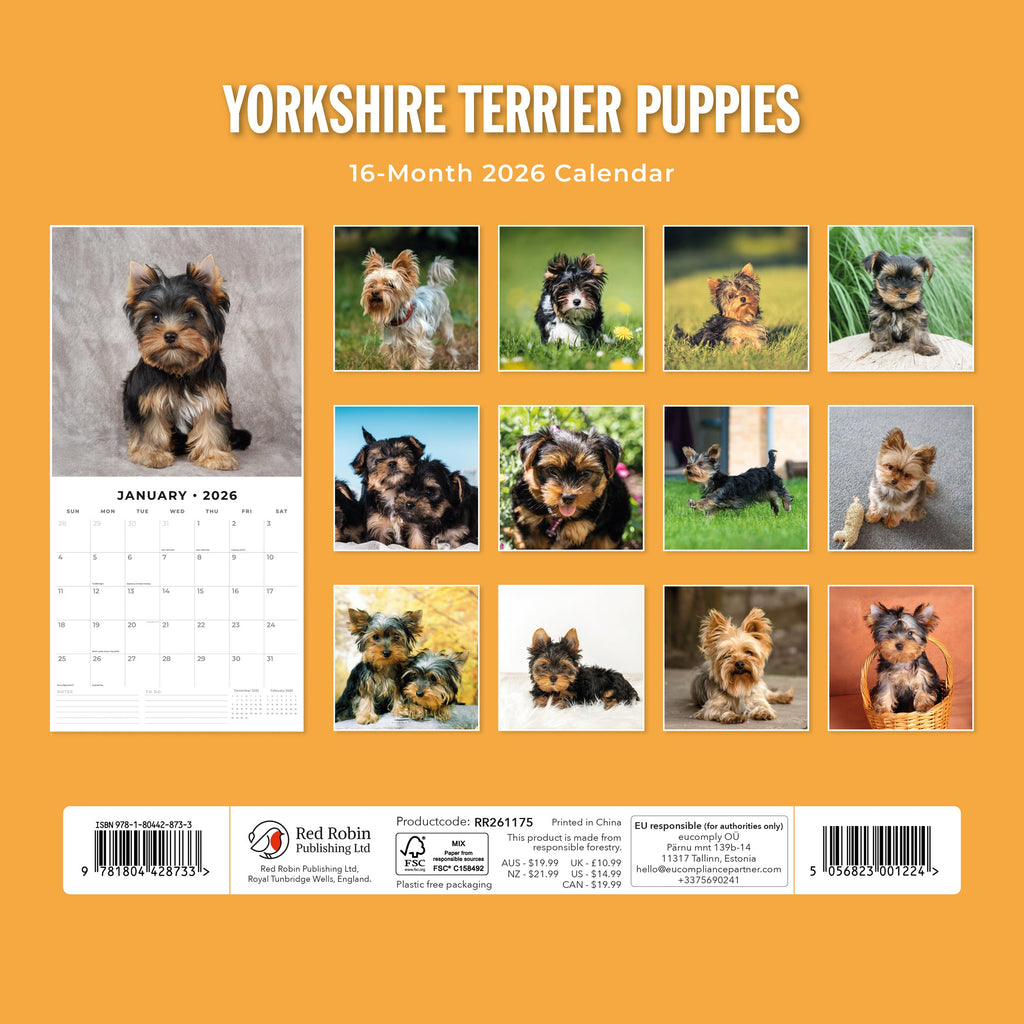 Packaged in a 100% plastic-free, sustainable, FSC-certified envelope, this 2026 Yorkshire Terrier Puppies Square Wall Calendar from Red Robin Publishing Ltd includes 12 months plus 4 bonus months, providing extended planning and a full year of enjoyment. .