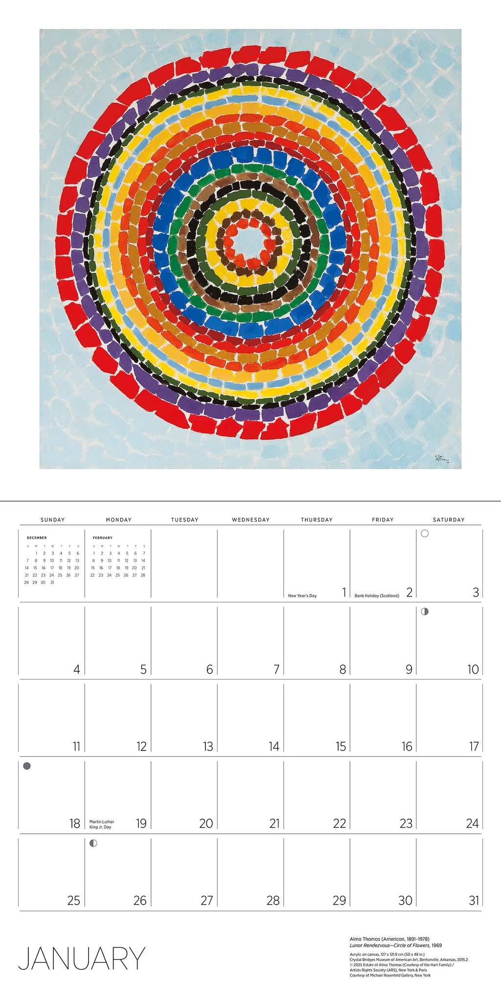 Alma Thomas, inspired by space exploration, gardens, and music, became one of the 20th centurys most innovative American painters. Moving from realism to abstraction and expressionism, she found her voice in a mosaic style that celebrated colour theory. Works like Lunar Rendezvous-Circle of Flowers and Apollo 12 Splash Down showcase her mastery of light, colour, and rhythm. Thomas was the first African American woman to have a solo exhibition at the Whitney Museum and have her art in the White House. Her vibrant paintings have left an indelible mark on modern art history. .