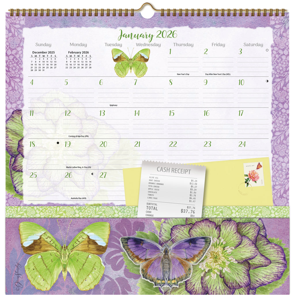 Stay on top of your schedule and organized in style with the 2026 Butterflies Note Nook Calendar by LANG. This clever 12-month wall calendar combines beautiful themed artwork with smart functionality, featuring two deep storage pockets every month to keep track of bills, receipts, coupons, appointment cards, and moreall in one tidy place.