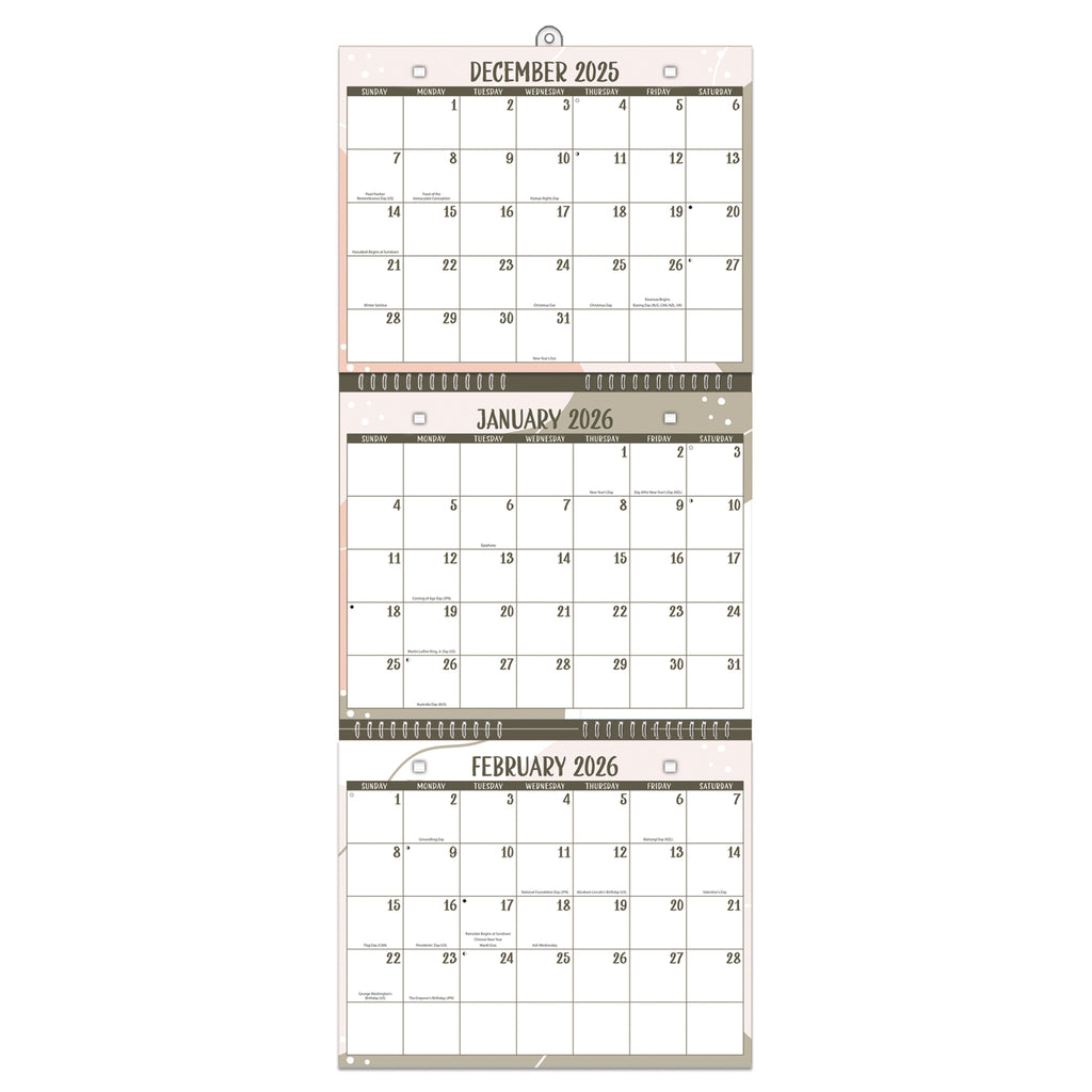 Each tear-off page features a clean, easy-to-read layout with three stacked monthly grids and a Sunday start. Major holidays and moon phases are included to help you stay informed and organized. A reinforced metal hanger provides durability and ensures the calendar stays securely in place throughout the year.