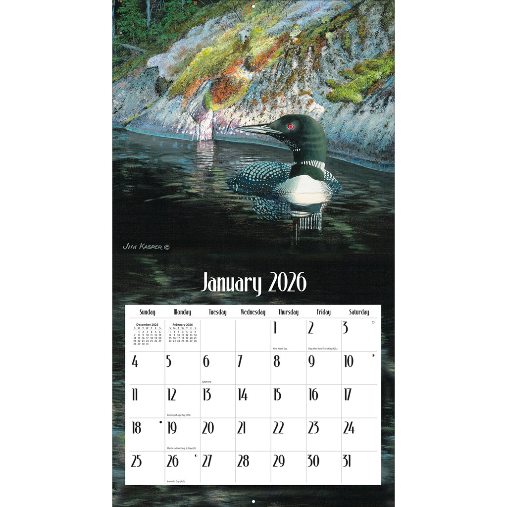 Lose yourself in the peaceful beauty of northern lakes with the 2026 *Loons on the Lake* Deluxe Wall Calendar. Each month showcases stunning painted scenes of serene waters, misty mornings, and the iconic silhouette of loons gliding across calm lakes. These tranquil images capture the quiet magic of the great outdoors in all four seasons.