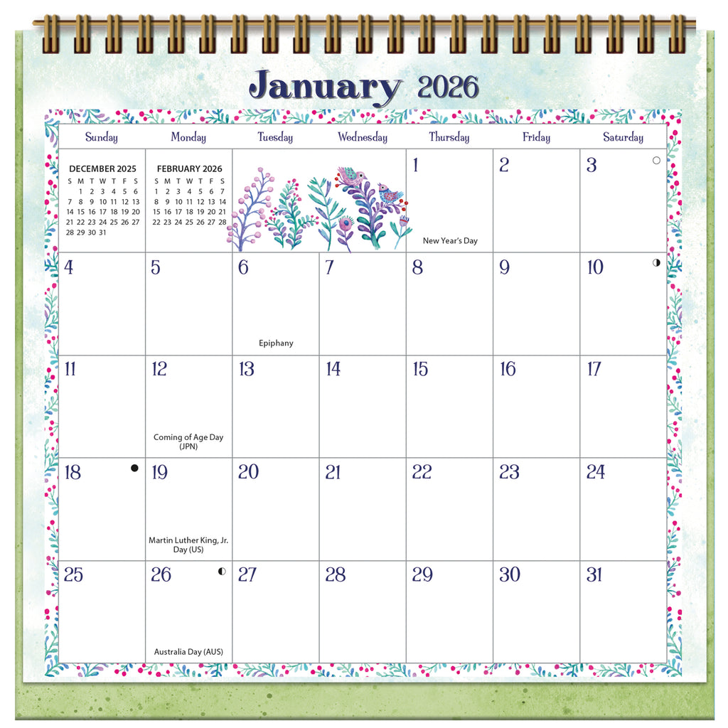 Add charm and function to your desk with the 2026 Simply Grateful Desk Easel Calendar by LANG. This compact calendar features a freestanding easel design, perfect for small spaces like desktops, shelves, or countertops. Each month showcases unique themed artwork paired with a simple monthly grid that starts on Sunday, offering just enough space to jot down key dates and reminders.