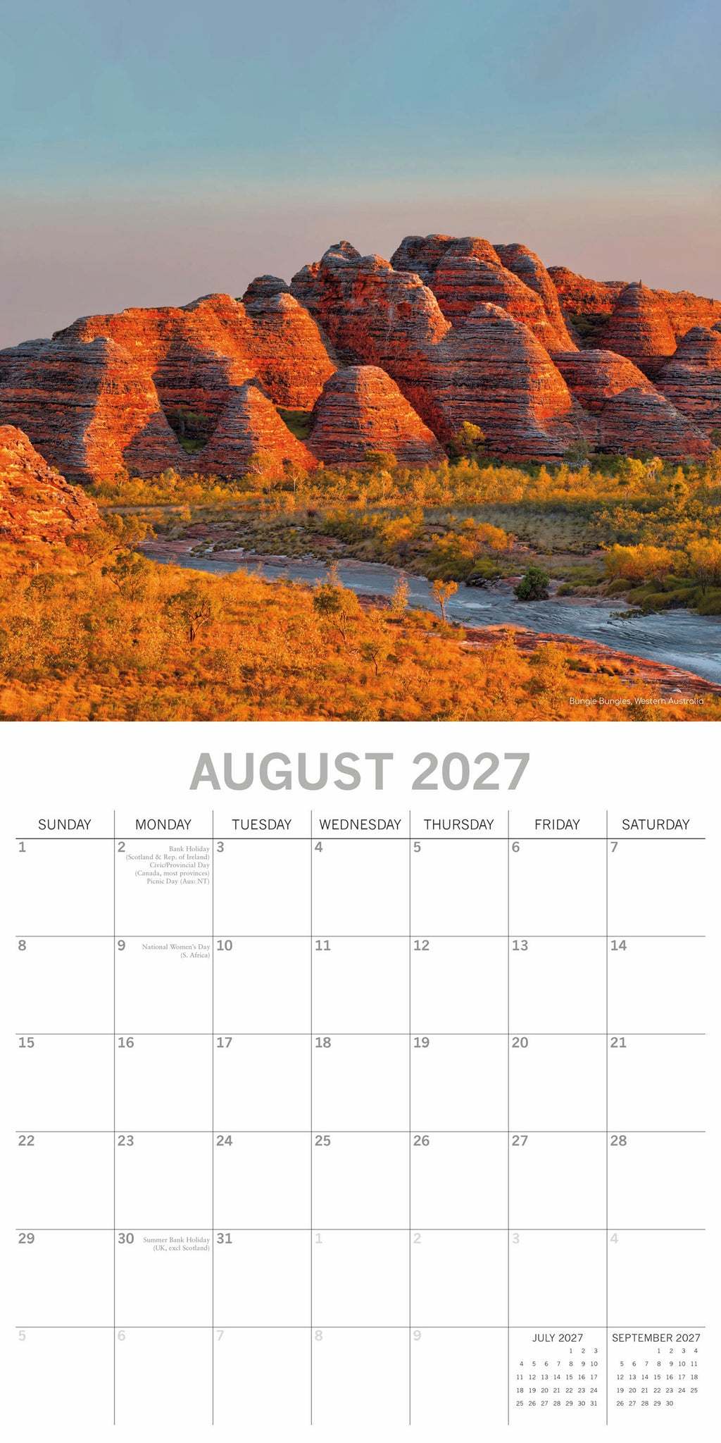 The 2027 Landmarks of Australia Square Wall Calendar spans 16 months—from September 2026 through December 2027—with the final four months of 2026 presented in a compact, mini-grid format. Each monthly spread begins on Sunday, with the top half showcasing a beautiful image and the bottom half featuring an easy-to-read monthly layout. The calendar comes shrink-wrapped for protection.