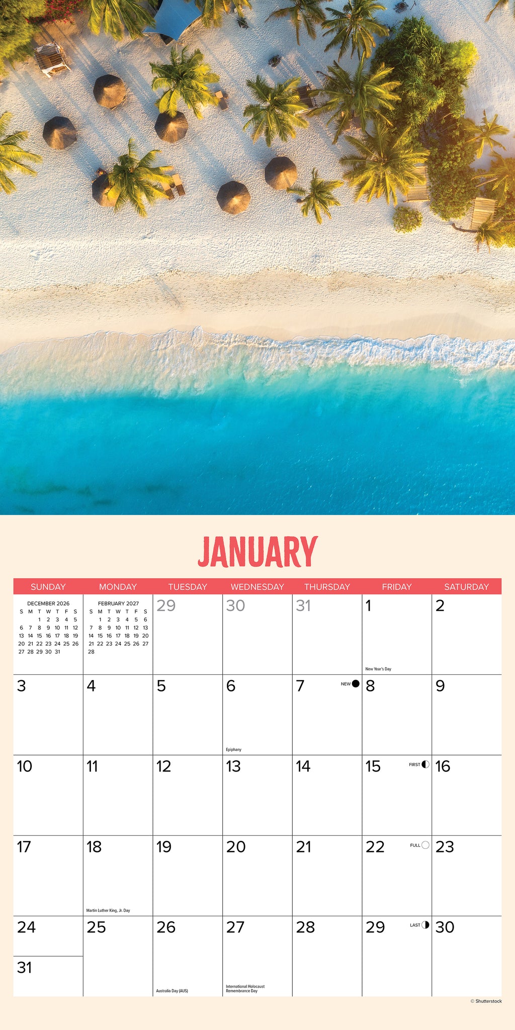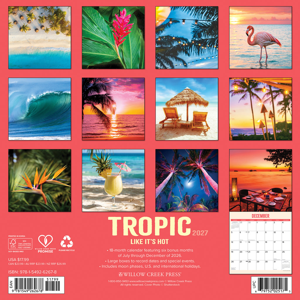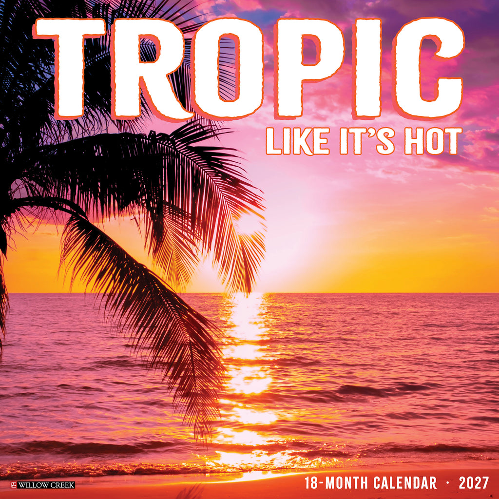 TROPICAL VIBES Ð The 2027 Tropic Like It's Hot calendar brings you a vibrant dose of paradise with every month, featuring lush greenery, fiery sunsets, refreshing drinks, and beachside bliss. Let each image transport you to warm, sun-soaked escapes that feel like a vacation all year long.