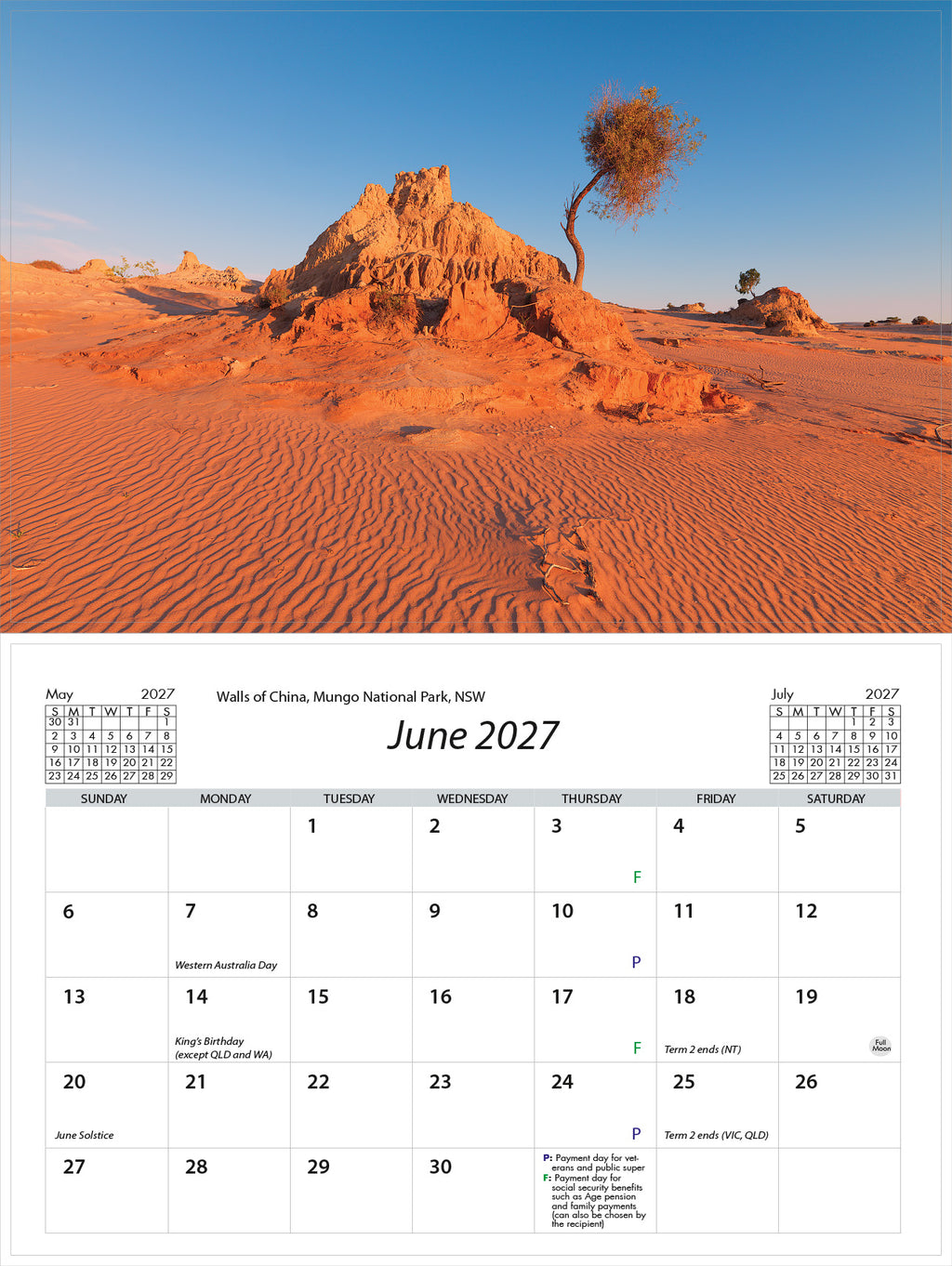 Each month in the 2027 Australian Inspirations - Desk Easel Calendar includes ample space to write in appointments, reminders and special events, plus previous and next month views. Australian school holidays, pension days, public holidays and moon phases are also included, making it a practical addition to any home, office or classroom.