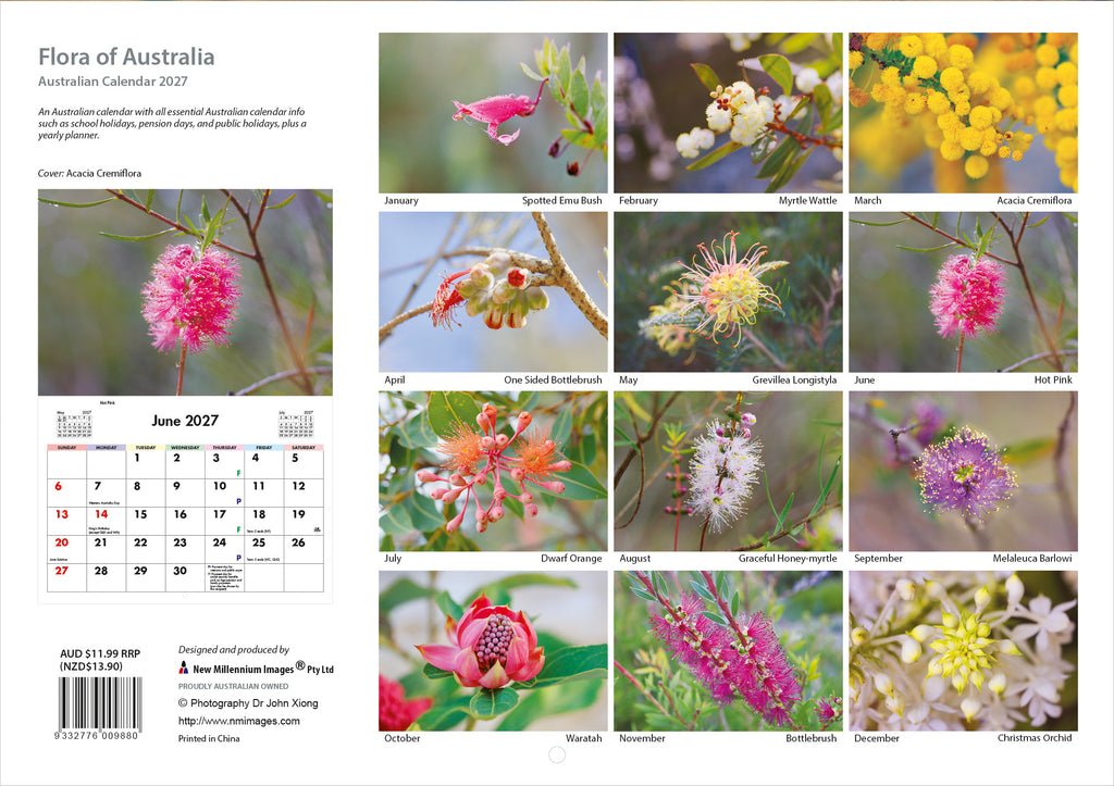 Each month in the 2027 Flora Of Australia - Horizontal Wall Calendar includes ample space to write in appointments, reminders and special events, plus previous and next month views. Australian school holidays, pension days, public holidays and moon phases are also included, making it a practical addition to any home, office or classroom.