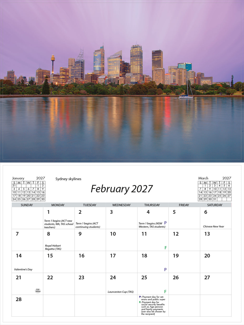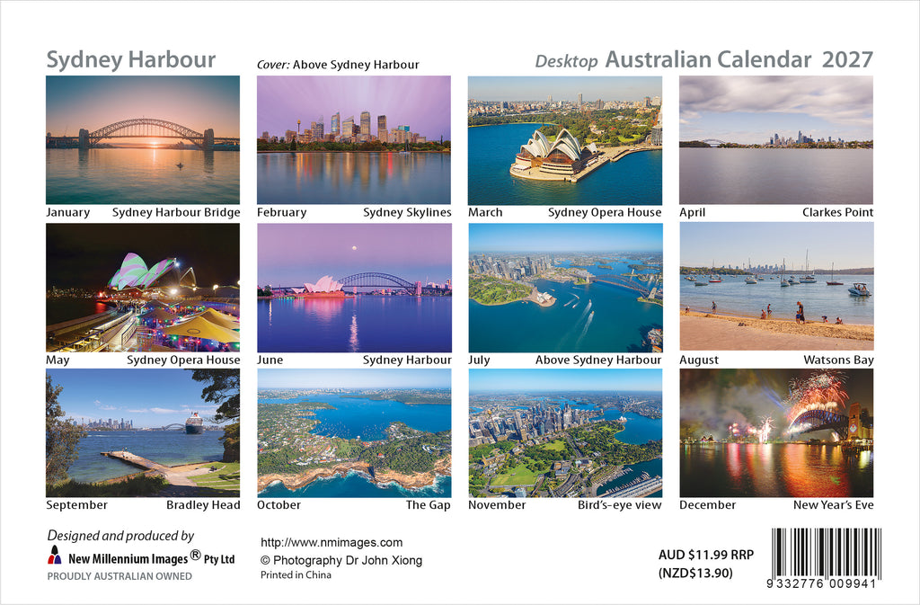 Each month in the 2027 Sydney Harbour - Desk Easel Calendar includes ample space to write in appointments, reminders and special events, plus previous and next month views. Australian school holidays, pension days, public holidays and moon phases are also included, making it a practical addition to any home, office or classroom.