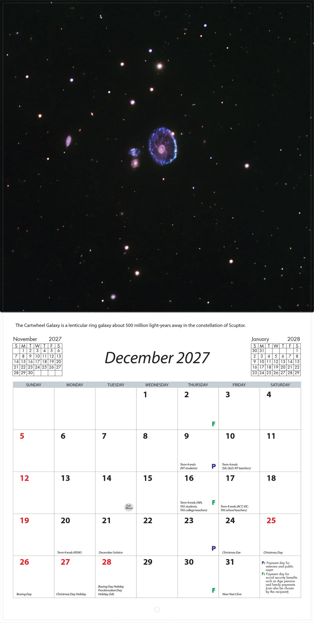 Each month in the 2027 Under The Southern Skies - Square Wall Calendar includes ample space to write in appointments, reminders and special events, plus previous and next month views. Australian school holidays, pension days, public holidays and moon phases are also included, making it a practical addition to any home, office or classroom.