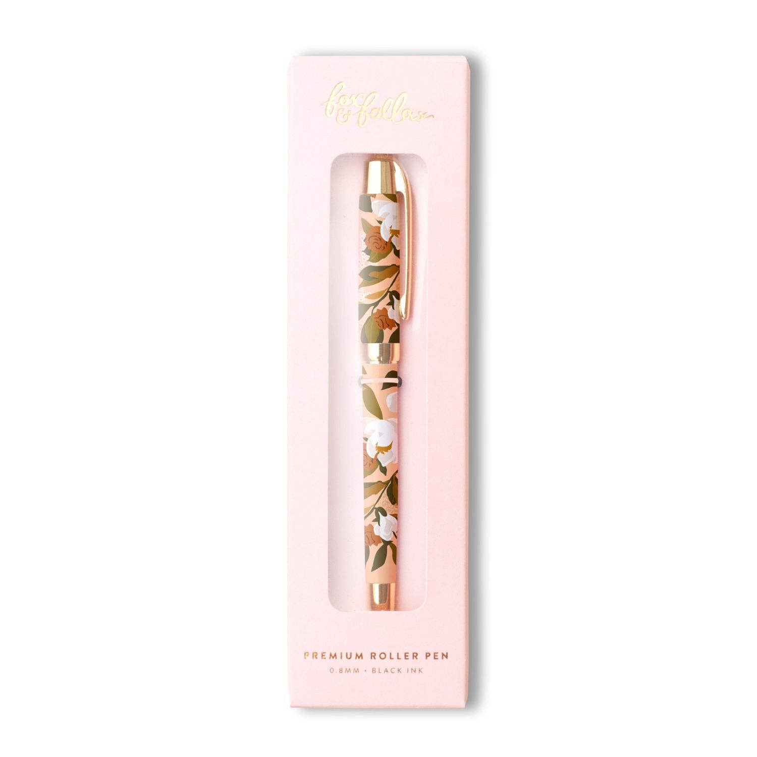 Size: 2 x 7.2 x 0.6 / 50 x 184 x 17mm. Material: Premium rollerball metal pen with full colour artwork and gold metal accents, refillable 0.8mm tip, black ink. Packaging: Pink cardboard box with clear plastic window and gold foil. Origin: Designed in Australia, made in China .